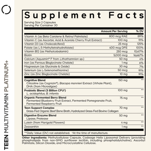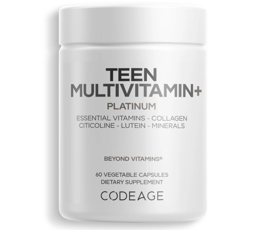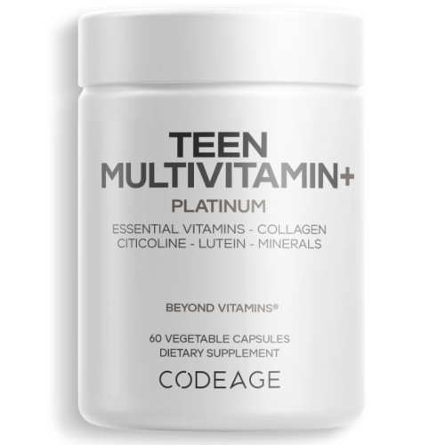 Codeage Teen Multivitamin+ Platinum — это премиальный мультвитамин, созданный специально для подростков в возрасте от 12 до 18 лет. Формула объединяет витамины (A, C, D3, E, K2, комплекс группы B и фолат), минералы (цинк, железо, магний, кальций и др.), а также коллаген, пробиотики, ферменты, цитиколин и растительные экстракты для поддержки роста, иммунитета, когнитивных функций и пищеварения.