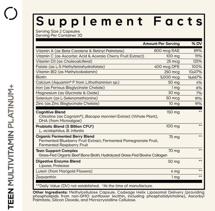 Витамин A (в виде бета-каротина и ретинилпальмитата); Витамин C (в виде аскорбиновой кислоты и экстракта плодов вишни ацеролы); Витамин D3 (в виде холекальциферола); Фолат (в виде L-5-метилтетрагидрофолата); Витамин B12 (в виде метилкобаламина); Биотин; Кальций (Aquamin® F из Lithothamnion sp.); Железо (в виде хелата бисглицината железа); Магний (в виде глицината и оксида); Селен (в виде L-селенометионина); Цинк (в виде хелата бисглицината цинка); Когнитивная смесь: цитиколин (в виде Cognizin®), экстракт Bacopa monnieri (целое растение), DHA (из микроводорослей); Пробиотическая смесь (5 миллиардов КОЕ‡): L. acidophilus, B. infantis; Смесь органически ферментированных ягод: экстракт ферментированных плодов черники, ферментированные плоды граната, ферментированные плоды малины; комплекс для поддержки подростков: органический костный бульон из говядины травяного откорма, гидролизованный коллаген из коровьего молока травяного откорма; смесь пищеварительных ферментов: липаза, протеаза; лютеин (из цветков бархатцев); зеаксантин. Другие ингредиенты: капсула из метилцеллюлозы, липосомальная система доставки Codeage Helix (содержащая фосфолипиды из не содержащего ГМО подсолнечного лецитина, включая фосфатидилхолин), аскорбилпальмитат, диоксид кремния и микрокристаллическая целлюлоза.
