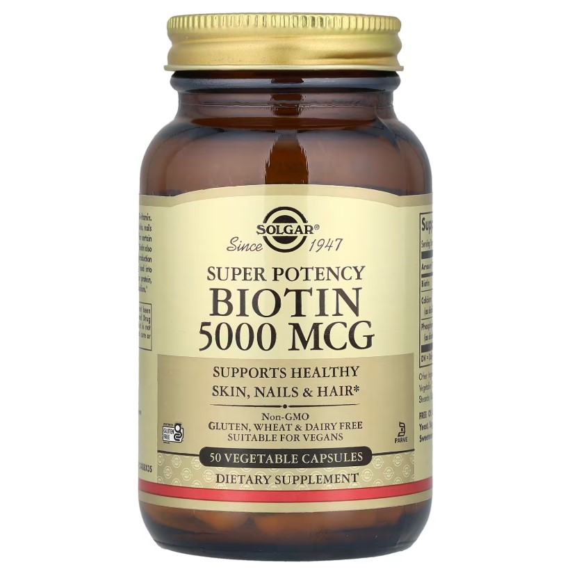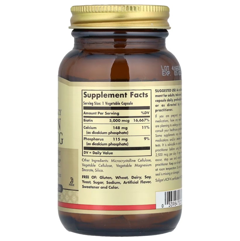 Solgar использует чистую, биодоступную форму биотина в растительных капсулах, без лишних добавок и аллергенов — идеальный выбор для длительного применения.