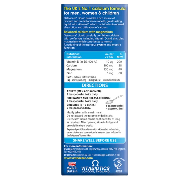 Osteocare Liquid от Vitabiotics — это сбалансированный комплекс минералов и витаминов в жидкой форме для поддержания здоровья костей, зубов и мышц. Формула содержит кальций, магний, витамин D3 и цинк, которые работают синергично для укрепления костной ткани и общего здоровья организма.