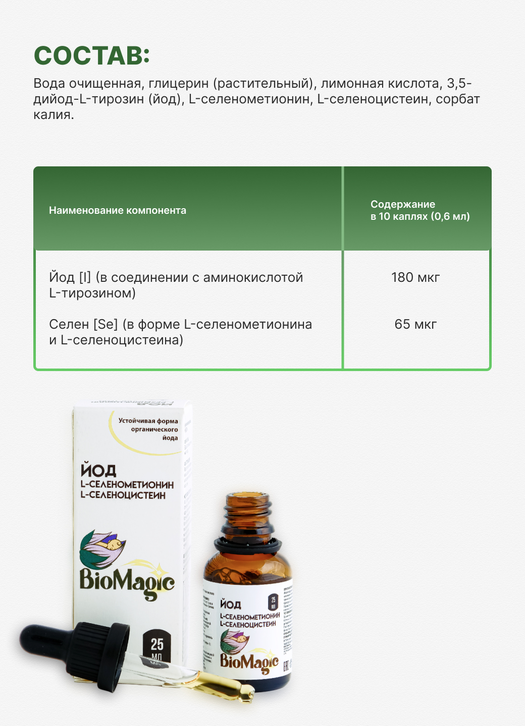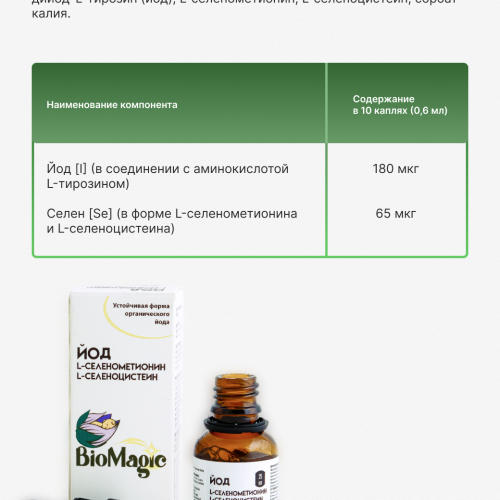 BioMagic Йод + Селен — это жидкая органическая форма йода (в соединении с L-тирозином, аналогично тому, как йод содержится в морских водорослях) и селена (в формах L-селенометионина и L-селенoцистеина), что обеспечивает максимально эффективное усвоение организмом.