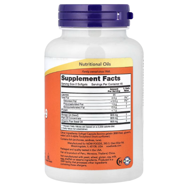 Now Foods - семейное предприятие, основанное в 1968 году, и член всемирной организации GOED Omega-3, что гарантирует высокое качество и эффективность его продукции. Комплекс содержит бурачник, семена льна и рыбий жир, богатые омега-3 жирными кислотами, которые, согласно предварительным исследованиям, могут снизить риск ишемической болезни сердца.