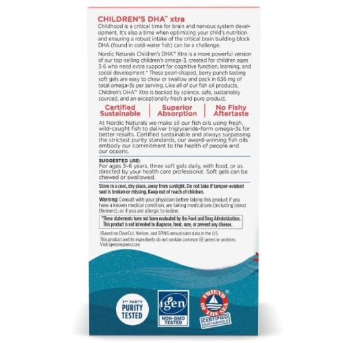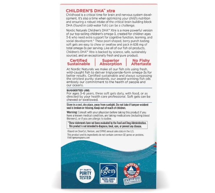 Children’s DHA Xtra от Nordic Naturals — это высококонцентрированная детская формула омега-3 жирных кислот, разработанная специально для детей от 3 до 6 лет. Продукт содержит повышенное количество ДГК (докозагексаеновой кислоты) — главного строительного компонента мозга, глаз и нервной системы ребёнка. Натуральный ягодный вкус делает приём приятным и удобным для детей.