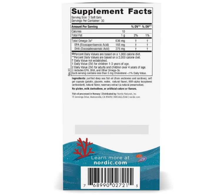 636 мг омега-3 в 1 порции, из них высокая доля ДГК (DHA)