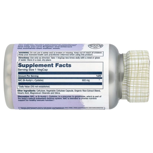 Solaray NAC (N-ацетилцистеин) — это высококачественная форма аминокислоты, которая служит предшественником глутатиона — одного из самых мощных антиоксидантов в организме.