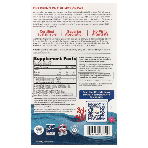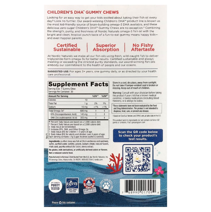 Nordic Naturals Children’s DHA — это детская жевательная форма омега-3 с высокой концентрацией DHA (докозагексаеновой кислоты), специально разработанная для поддержки развития мозга, нервной системы и зрения у детей.