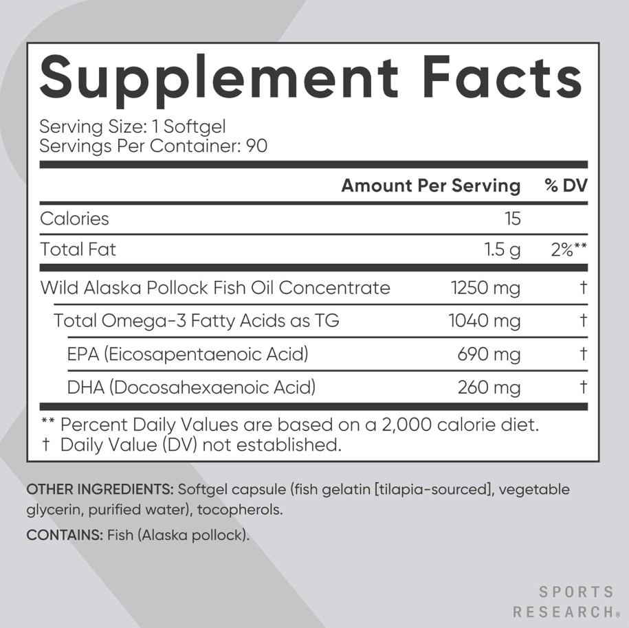 🐟 Sports Research Alaskan Omega-3 Fish Oil, Аляскинский рыбий жир с омега-3, тройная эффективность, 1250 мг, 90 мягких таблеток