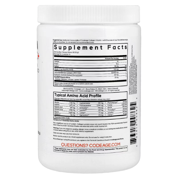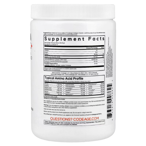 Codeage Collagen + Vitamin C — bu gidrolizlangan kollagen va vitamin C ni birlashtirgan premium kompleks bo‘lib, teri, bo‘g‘imlar, soch va umumiy yoshartiruvchi qo‘llab-quvvatlash uchun ishlab chiqilgan.