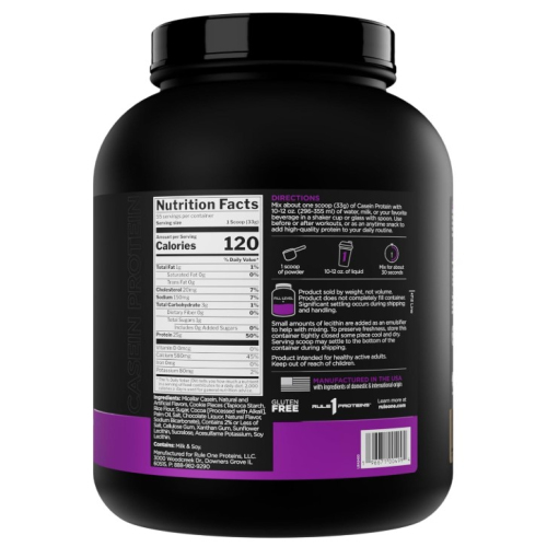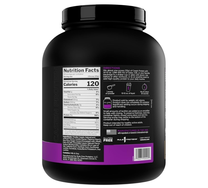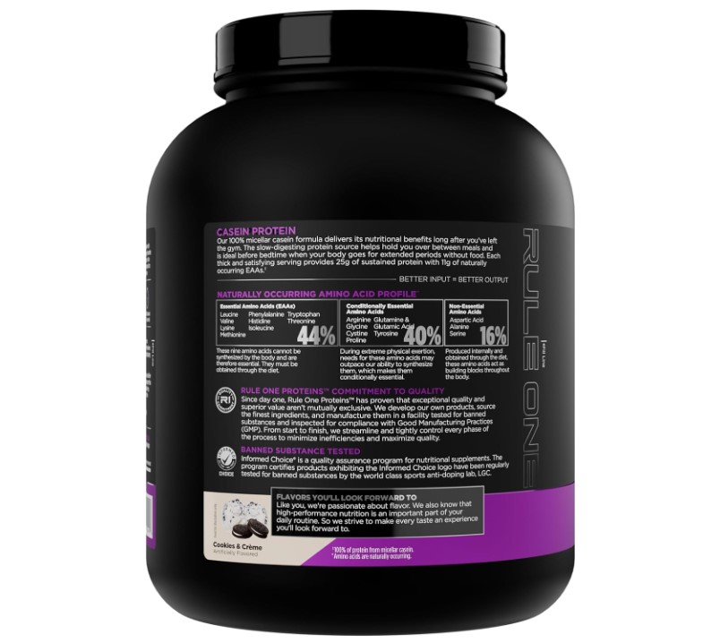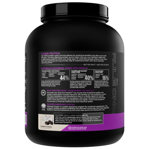 Rule One 100% Micellar Casein — bu yuqori sifatli, sekin hazm bo‘ladigan mikellyar kazein oqsili bo‘lib, mushaklarni 7–8 soat davomida aminokislotalar bilan ta’minlaydi. U tungi katabolizmni (mushak parchalanishi) oldini oladi va uyqudan oldin yoki uzun och qolish davrlarida ichish uchun ideal hisoblanadi.