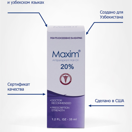 Купить Maxim Antiperspirant Roll-On 20%, 29.6 мл можно на сайте Evitamin.uz — оригинальный американский продукт, рекомендованный дерматологами, с быстрой доставкой по всему Узбекистану.