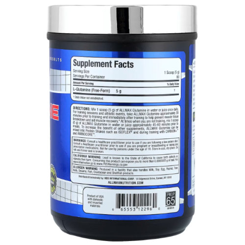 ALLMAX Glutamine — это чистая форма аминокислоты L-глутамин, которая играет ключевую роль в восстановлении мышц, поддержке иммунной системы и здоровье кишечника.