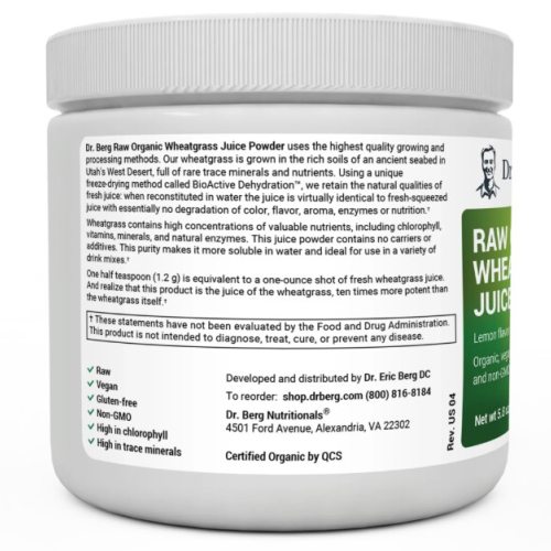 Dr. Berg Raw Organic Wheatgrass Juice Powder — это органический порошок из свежего сока ростков пшеницы, полученный методом бережной сушки при низких температурах, что сохраняет максимум полезных нутриентов.