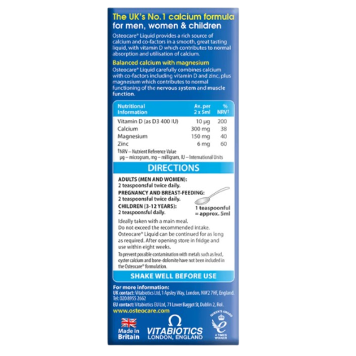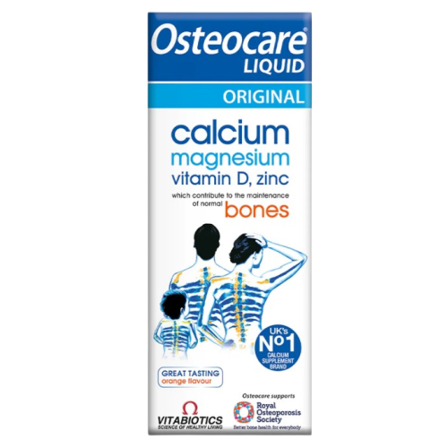 Osteocare Liquid от Vitabiotics — это сбалансированный комплекс минералов и витаминов в жидкой форме для поддержания здоровья костей, зубов и мышц. Формула содержит кальций, магний, витамин D3 и цинк, которые работают синергично для укрепления костной ткани и общего здоровья организма.