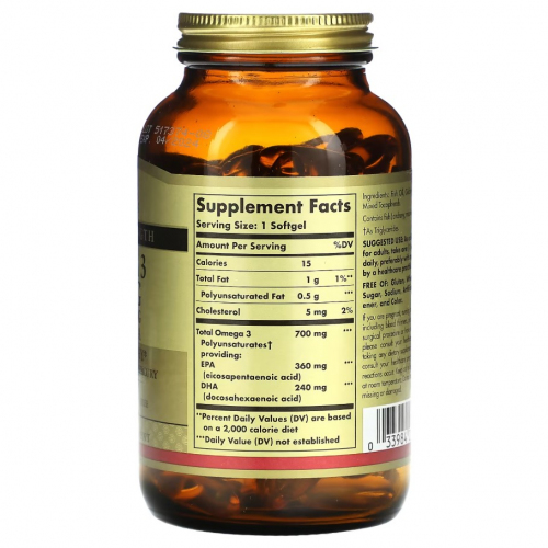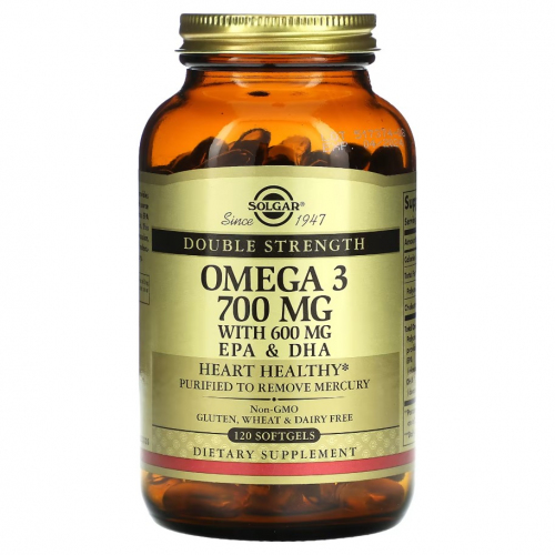 Solgar Omega-3 Double Strength – это концентрированный комплекс высококачественных жирных кислот Омега-3 в усиленной дозировке (700 мг ЭПК и ДГК). Продукт изготовлен из тщательно очищенного рыбьего жира холодноводных рыб, что гарантирует максимальную чистоту и эффективность. Регулярный приём способствует укреплению сердечно-сосудистой системы, улучшению работы мозга и зрения, а также поддержке иммунитета.