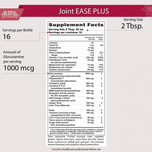 Buried Treasure Joint Ease Plus — это жидкая добавка премиум-класса, разработанная для поддержания здоровья суставов и связок. Формула сочетает глюкозамин, хондроитин, МСМ (метилсульфонилметан) и куркуму для комплексной поддержки суставов, улучшения подвижности и снижения воспаления.