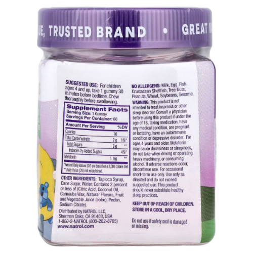 Natrol® Kids Melatonin предлагает 1 мг мягкого мелатонина в удобной форме жевательных таблеток. Этот природный гормон сна помогает ребенку засыпать быстрее и спать глубже. Наш продукт не вызывает привыкания и не содержит глютена, что делает его безопасным выбором для вашего малыша.